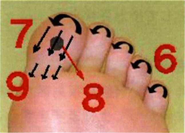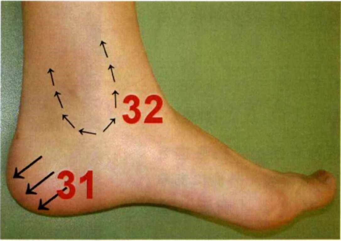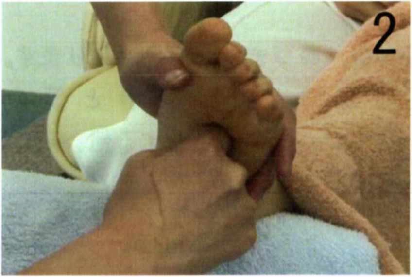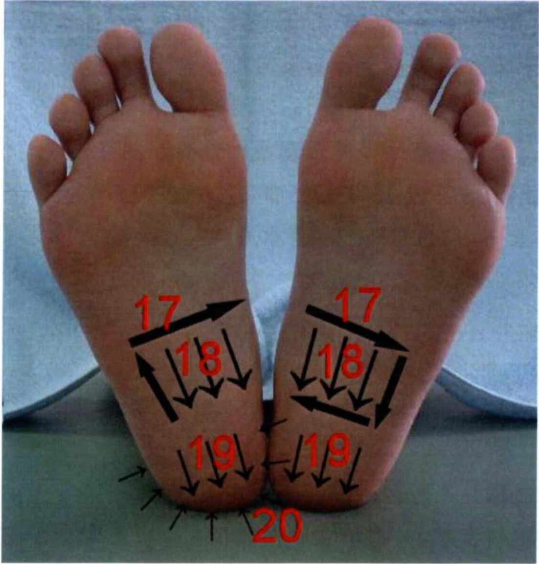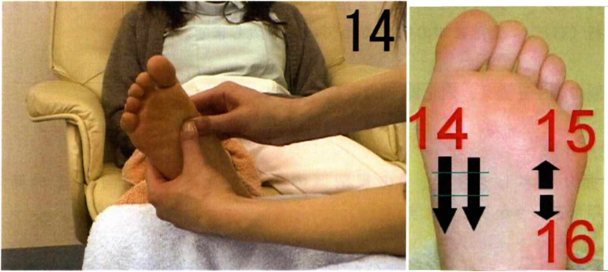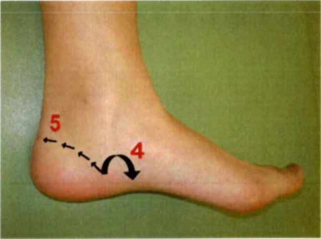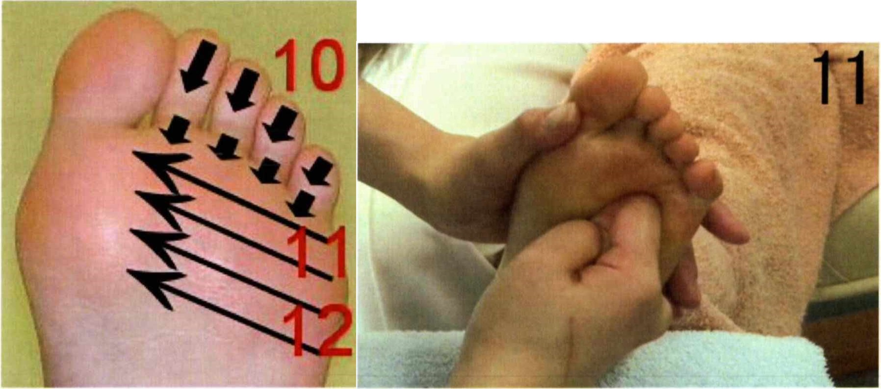 | 上行(右): | 踵骨の上第4指と第5指の間を土踏まずの中心までかき上げます。 |