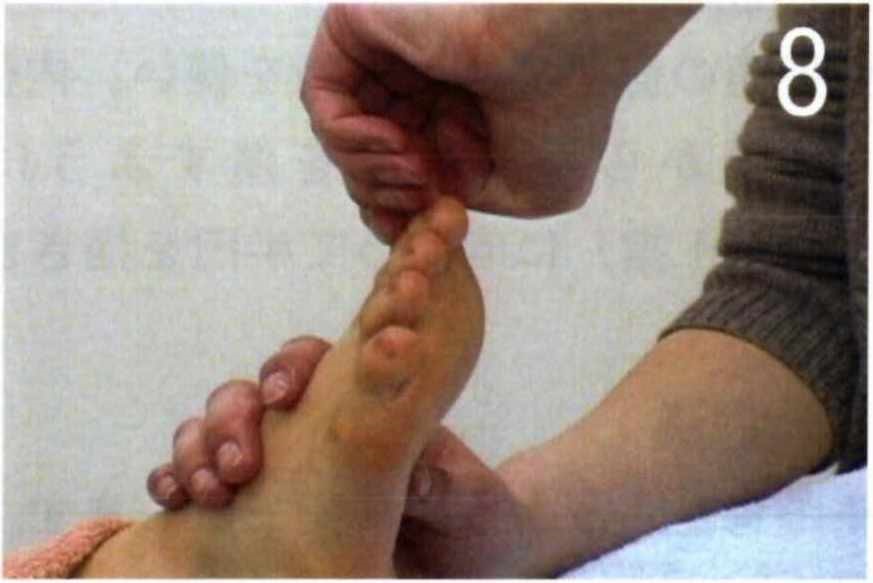◆束骨の下、中足骨の際を両拇指でさすり流します。