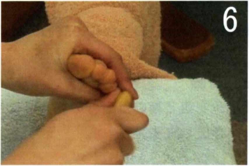 ◆指先を第5指側より足心棒を使いかき出します。足心棒は握るように持ち、拇指を軸にして使うと安定した圧がかかります。