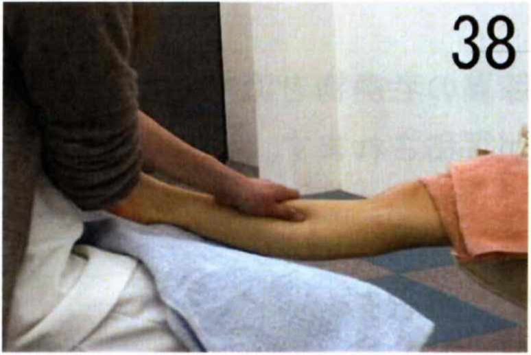 両拇指で脛骨の際を膝から足首に向かつて押さえます。次に胃経の経絡を同様に押さえます。最後に足を軽く押さえ前頸骨筋をこぶしで叩きます。