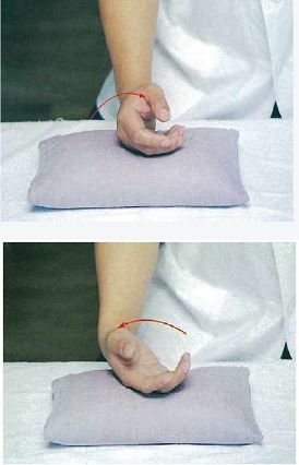 手技:片手は患者の肘を持ち、もう片方の手の甲を転がすように肩から肘に向かって一方向に按摩する。4~5回行う。反対の上腕も行う。