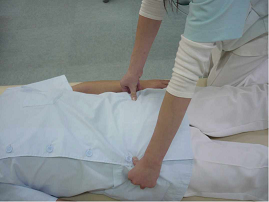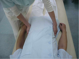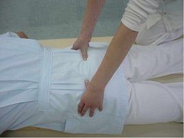- 左右の上前腸骨棘の外側面に手掌を当てる。