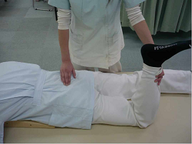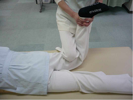 - 患者の大腿部が浮かない様、右足を軽く乗せ 固定する。両手で足首を持ち上方へとゆっくり牽引する。