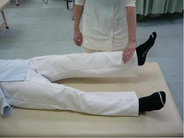 3. 膝関節を伸展させたまま脚全体を下げさせ、抑制するよう圧をかける。