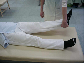 3. 膝関節を屈曲させたまま膝を閉じさせ、抑制するよう圧をかける。