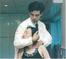 首・肩周辺の筋に一指禅法、按揉法、滾法、拿法(写真上)を施します。