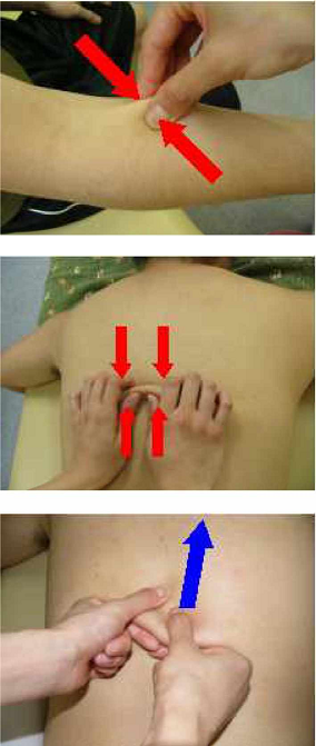檸法は、皮下組織を挟むだけで、筋肉は挟みません。檸法は頚、胸、背、腹の経穴あるいは患部に用い、皮膚が充血するまで行います。