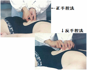 母指と四指を用いて提捏し、緩めるときには筋肉が手指から離れてないようにします。片手または両手で操作します。把握揉捏法の刺激は強いので、始めは軽く次第に重くし、同じ部位に5~10回程度します。