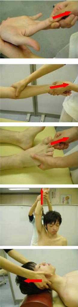 頚椎周辺筋・肩・肩関節・肩先と上腕の間の腋窩・肘関節を一指禅法、按揉法、 滾法、拿法を用い緩める。