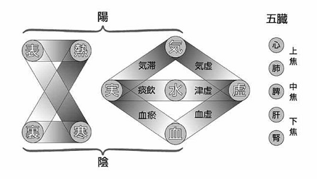 中医学では、人間は本来、バランスのとれた生理機能をそなえた整体であると考えます。そのバランスが崩れた時、たとえば体内の陰と陽のバランスが崩れたり、気血の流れが滞ると病気になると考えています。また、怪我をして体の一部に損傷を受けると、気や血も損傷を受け、内臓にもその損傷は及んでいくと考えています。