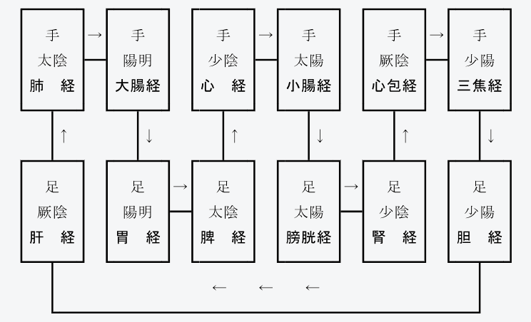 十二経脈は、手三陽(陽明大腸経、少陽三焦経、太陽小腸経)、手三陰(太陰肺経、厥陰心包経、手少陰心経)、足三陽(陽明胃経、少陽胆経、太陽膀胱経)、足三陰(太陰脾経、蕨陰肝経、少陰腎経)で成り立ち、これらの経脈は一定の循環経路を持ち、「経」と「経」とで密接に連絡をとっています。