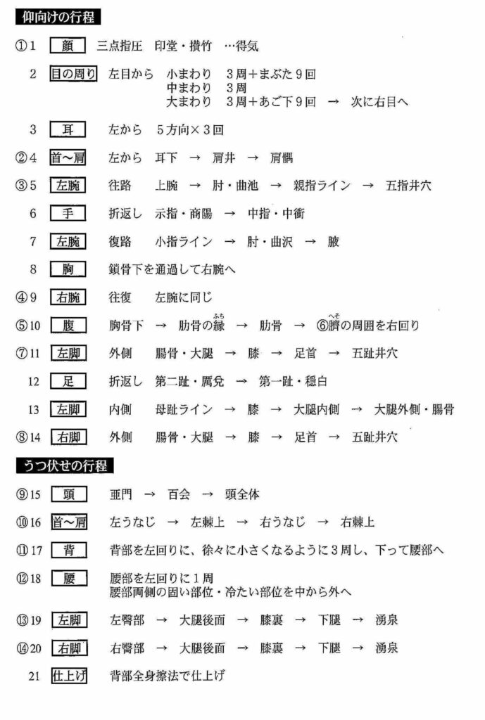 陰陽では、上が陽、下が陰です。左が陽、右が陰です。よって、経脈の巡行を基調としながらも「陽から陰へ」の通り、全身経筋捏法の手順は、「上から下」、「左から右」という方向性を持って施術します。