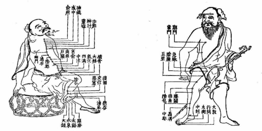 | 足厥陰之筋。 起於大指之上、上結於内踝之前、上循脛、上結内輔之下、上循陰股、 結於陰器、絡諸筋。 足厥陰経筋 足の親指の上から始まり、内くるぶしの前で結ばれます。さらに脛を上り、脛骨の下で結ばれます。続いて内腿を上り、陰部で結ばれ、そこから様々な筋に絡みます。 |