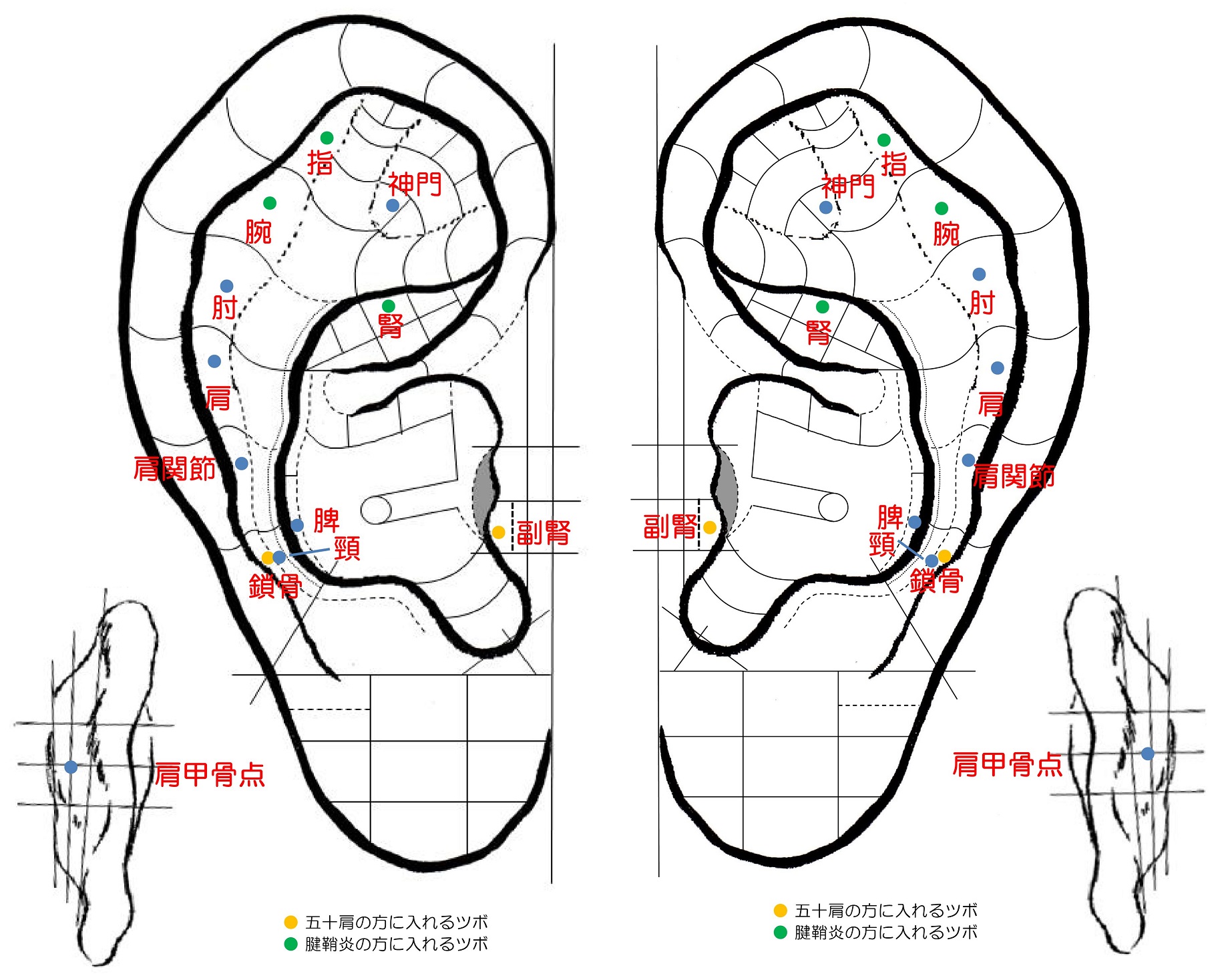 肩こり 2022.12.132025.07.01 実技編 3 肩こり 神門 各種神経系倒の鎮痛・鎮静・消炎、療、痛、抗アルキー、心血管系・呼吸・消化器系疾患の鎮痛 肩 肩こり、肩関節の損傷・痛み・腱鞘炎・麻痺、上腕筋腱炎、峰下滑波包炎、頚椎症 肩関節 肩こり、肩関節の損傷・痛み・腱鞘炎・麻痺 頸 頸部の凝り・痛み・捻挫、寝違い、頸部リンバ節炎、甲状腺肥大症 肩甲骨点 肩甲骨周辺の凝り、脂肪燃焼作用 肘 肘関節の痛み・腫れ・関節炎・神経痛、リウマチ、テニス肘 注:肩こりでも症状にょって痛む部位が異なります。 2 腰痛 Home 4 便秘